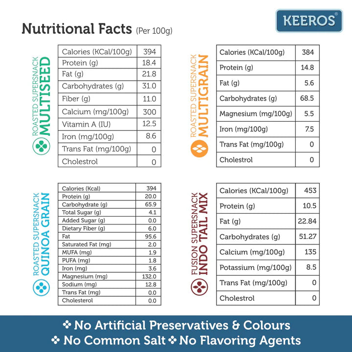 - PACKAGE CONTAINS: 4 Bigger Packs of our Roasted SuperSnacks : 1x400g of Multigrain, 1x250g of Multiseed, 1x250g of Quinoa Grain & 1x100g of Quinoa MilletsÂ