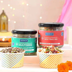 - ENJOY OUR FESTIVE FLAVOURS: MULTISEED: Slightly sweet mix of 4 superseeds & dry dates; MULTIGRAIN: Lightly salted mix of Pearl Millets & 5 roasted super grains; QUINOA GRAIN: Lightly spiced mix of Quinoa puffs & 4 roasted super grains. INDO TRAIL MIX : Slightly Sweet mix of superfruits, nuts & superseeds; 1x40g of Chocolate Coated Cashews, 1x40g of Chocolate Coated Almonds