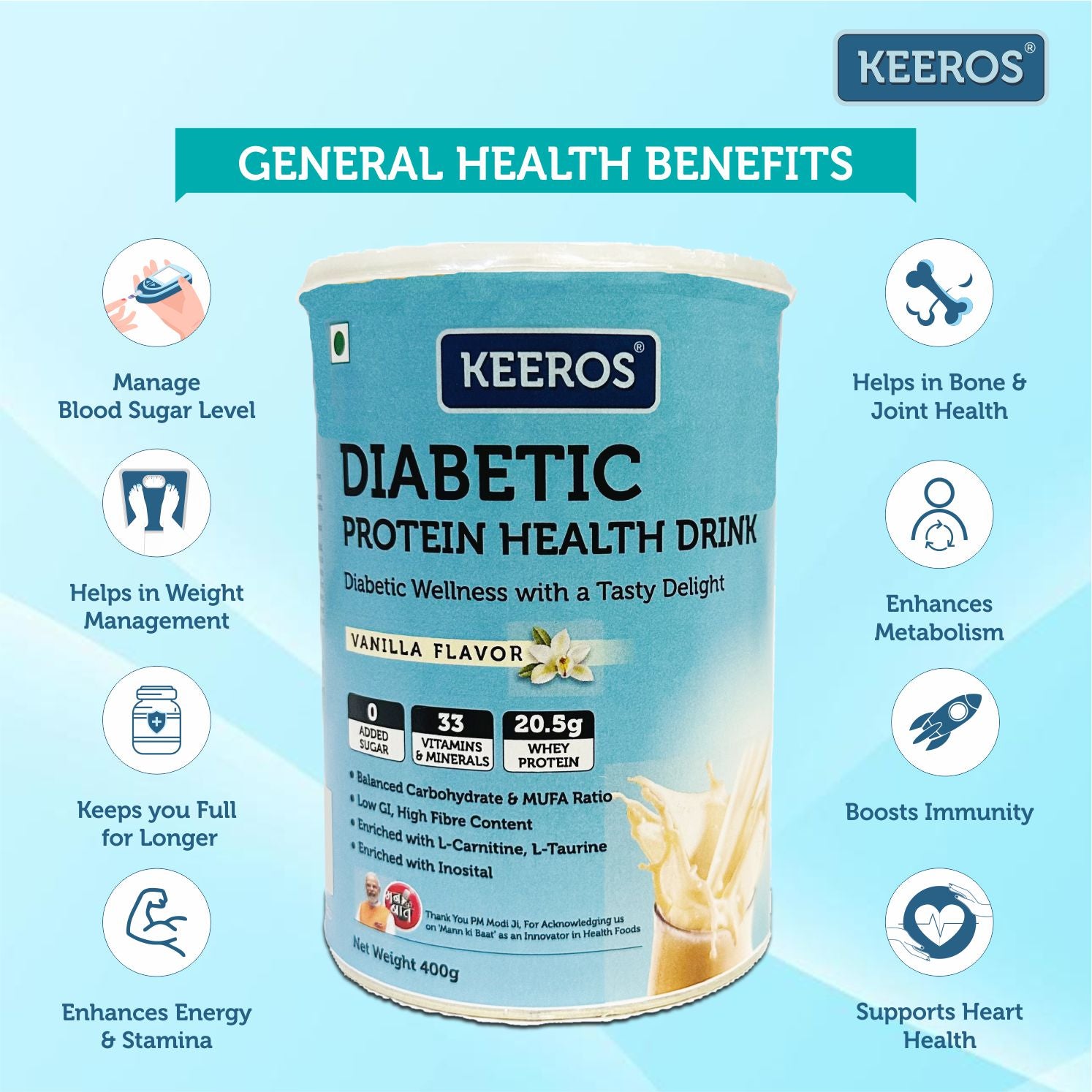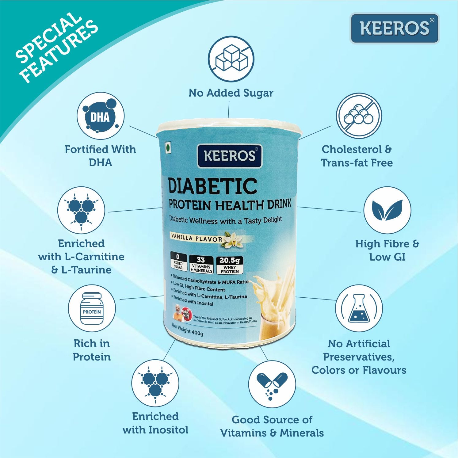 Keeros DiabStrong Diabetic Protein Nutrition Drink 400g - Vanilla Flavor | Diabetic Friendly, High Fiber, Balanced Carbohydrate & MUFA | General Health Benefits with DHA | Nutrient-Rich Supplement for Overall Wellness