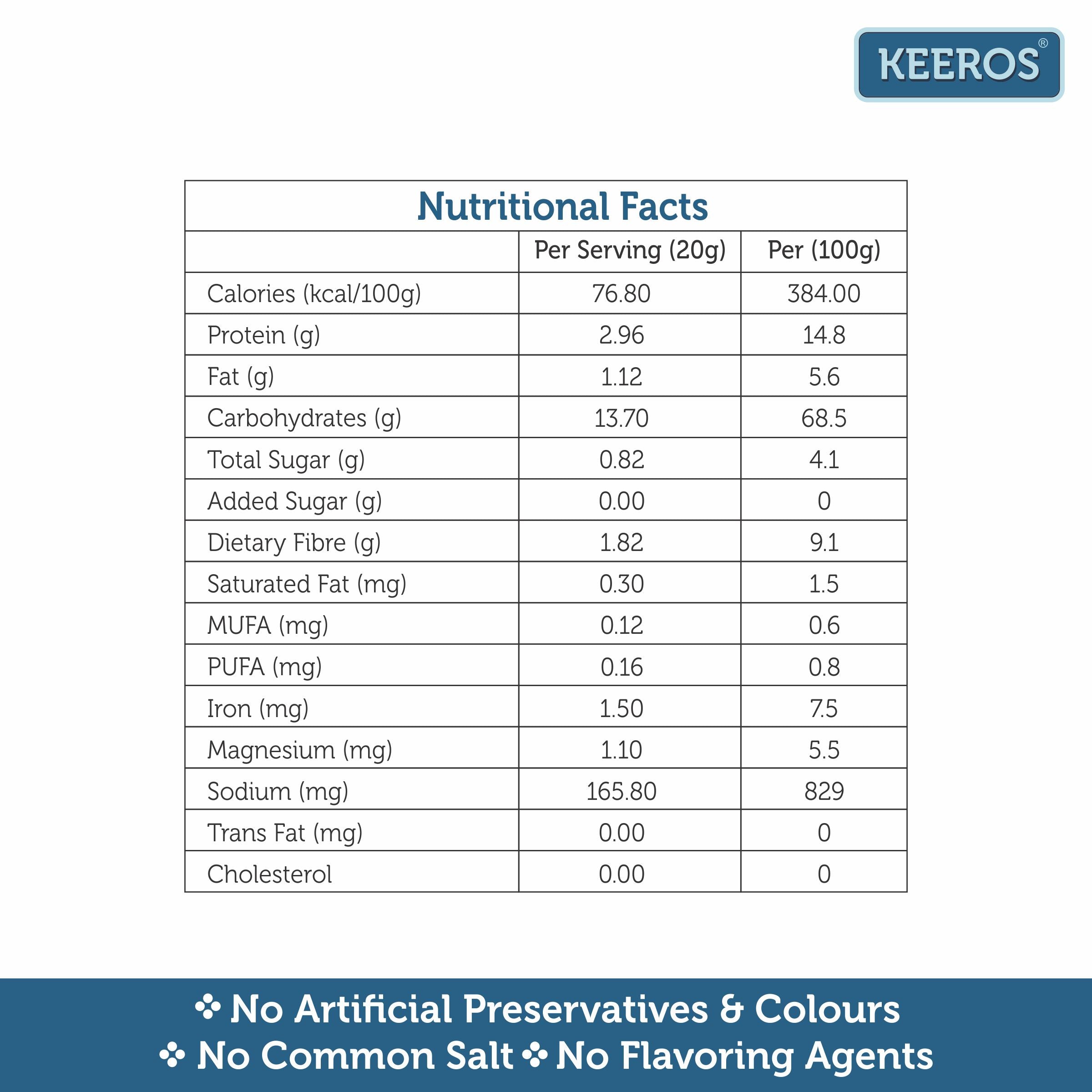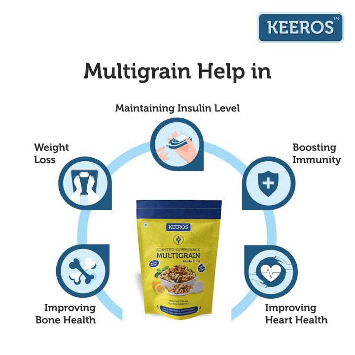 • LOW FAT, LOW CALORIE & 100% NATURAL : Keeros Multigrain has 6 super grains in most natural form with minimal processing & full fibre content making it an ideal meal replacement for weight loss. Hence, it is a healthy snack for weight loss & good alternative to fried snacks & namkeens. Having Zero Cholesterol & Zero Trans-Fats this Diet food snack is also good for Heart Health. So make Keeros the essential diet snacks in your pantry.