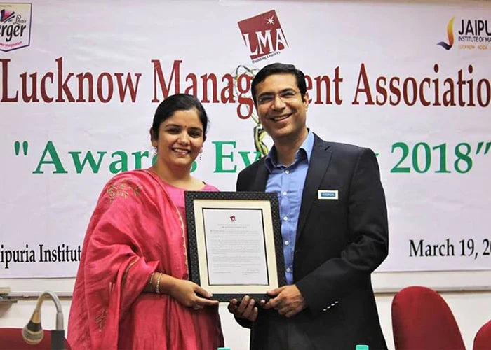 Co-founders Simran and Sachin Sahni receiving the award for Startup of the Year, 2018 , by Lucknow Management Association.