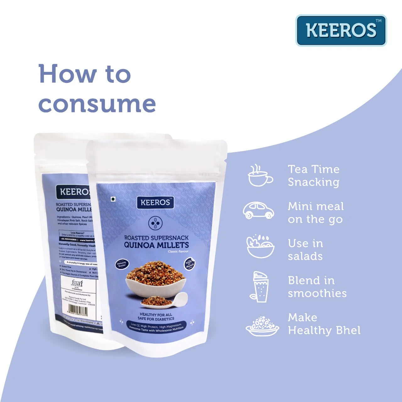 I am: A lightly spiced & tangy roasted supersnack! Love to munch on something crunchy, light and flavoursome? I contain a delightfully healthy combination of the mother of grains- Quinoa and pearl millet. A combination which is loaded with punch of protein, fiber, iron, phosphorus and calcium. I am a top Vegan source of complete plant based protein. Keep me close by at all times or just carry me in your everyday bag and just pop me out whenever you get the urge to munch.