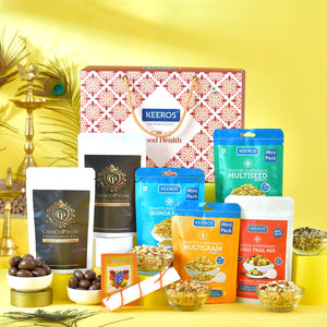 Keeros Bhai Dooj Gift Hamper with Roli Moli Chandan Tikka Chawal Mishri I Gift Hamper with Chocolate-Coated Almonds & Cashews, Tasty & Crunchy Supersnacks | Nutritious Superfoods in a beautiful Gift Box | Ideal for Healthy Snacking