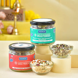 - INGREDIENTS : Vegetarian, Vegan Ready to eat Food Products; Package Contents: Value pack of 4 reusable Glass Jars -1x150g of Multi Seed, 1x115g of Indo Trail Mix, 1x170g of Chocolate Coated Cashews, 1x170g of Chocolate Coated Almonds + Diwali Card